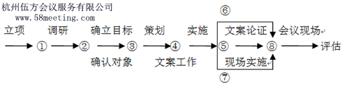 舉辦企業(yè)會議可以分為五個階段,即立項、調(diào)研、策劃、實施和評估階段,如下列流程圖:
